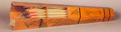 tabung heksagonal berisi buluh-buluh kayu sebagai anak panah. Berbeda